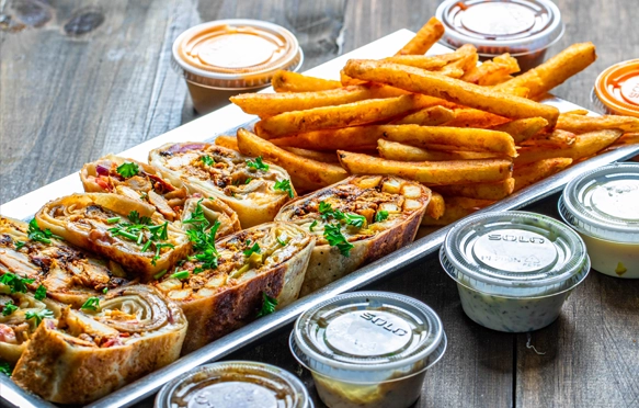Sandwich cut -to- bite size served with fries, with your choice of 2 sauces.